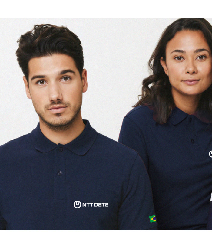 Polo 100% piquet com bordado NTTDATA no peito esquerdo e bandeira do Brasil na manga esquerda.